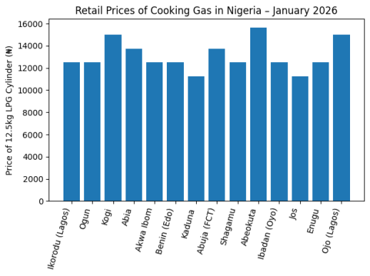 The retail prices of Liquefied Petroleum Gas (LPG) across selected Nigerian cities in January 2026 reveal a market that is uneven, location-sensitive, and structurally influenced by logistics rather than scarcity. Despite Nigeria’s growing domestic gas ambitions, retail LPG pricing continues to reflect long-standing infrastructural, geographic, and distribution challenges. Across the surveyed locations, the average retail cost of a 12.5kg cylinder stands at ₦13,080.36, translating to an approximate national average of ₦1,046 per kilogram. While this average suggests relative price stability, a closer look shows significant intra-regional variation, with price differences of over ₦4,000 for the same 12.5kg cylinder depending on location.
